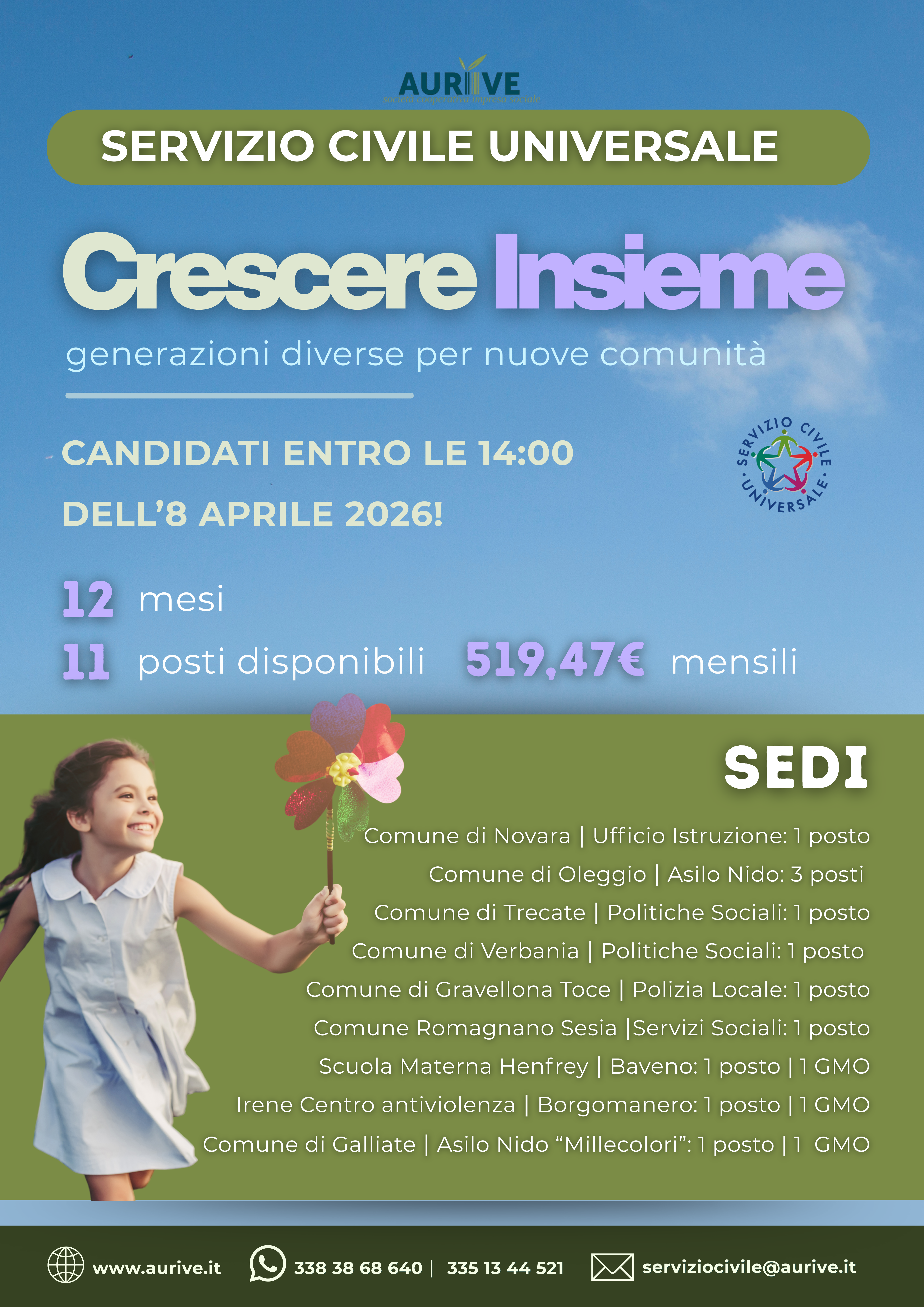 E' aperto il nuovo bando di servizio civile universale 2026: sono 125 i posti disponibili, nell'ambito di 11 progetti specifici, elaborati e presentati dalla Coopertativa Aurive di Novara.