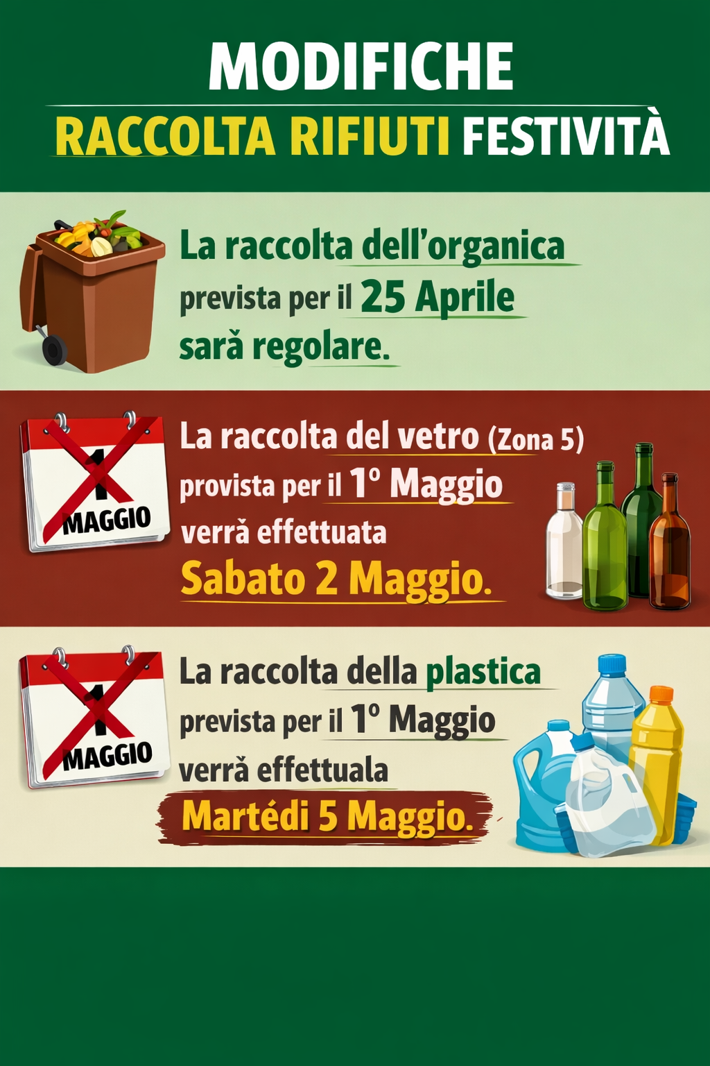 - la raccolta del vetro (zona 5) prevista per il 1° Maggio verrà effettuata sabato 2 Maggio;
